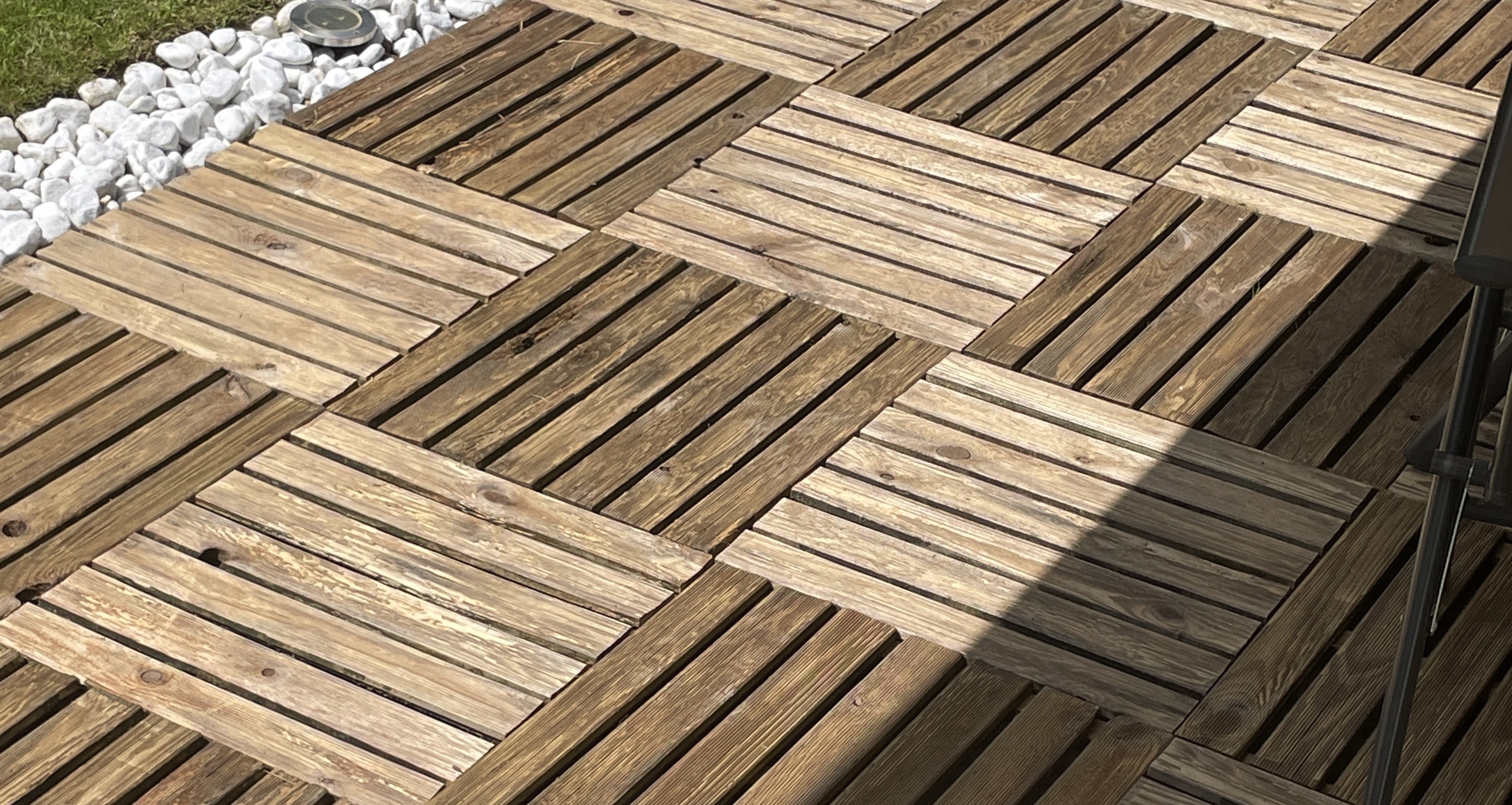 Holzfliesen mit Moos-, Farb-, Lackflecken